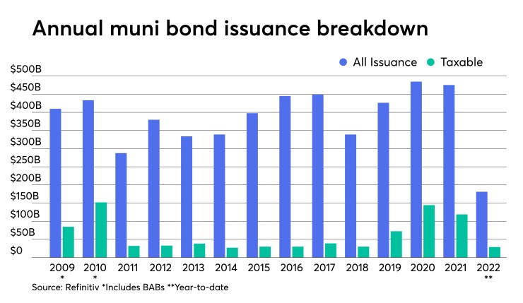 “Due to the Fed’s tightening and higher rates, even if general market rates go down significantly and yield curves go much flatter in 2H22, there is likely not enough time for refunding volumes to meet our $180 billion expectation for the year,” equating to a $70 billion drop, they said in a report Friday. They expect new-money to increase slightly, putting their projections at $500 billion total.