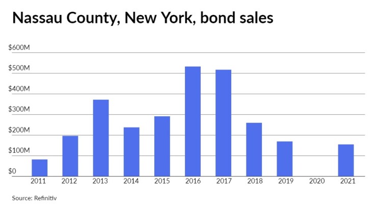 Nassau County last competitively sold GOs on April 6, 2021, when Jefferies won the $155.11 million of Series 2021A GOs with a true interest cost of 2.8219%.