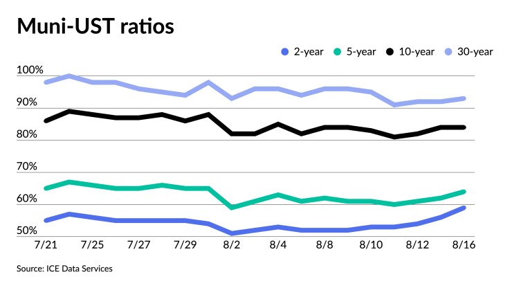 Short muni-UST ratios rose with the two- and three-year ratios, reaching near 60%. The five-year was at 64%, the 10-year at 81% and the 30-year at 96%, according to Refinitiv MMD’s 3 p.m. read. ICE Data Services had the five at 64%, the 10 at 84% and the 30 at 93% at a 3:30 p.m. read.